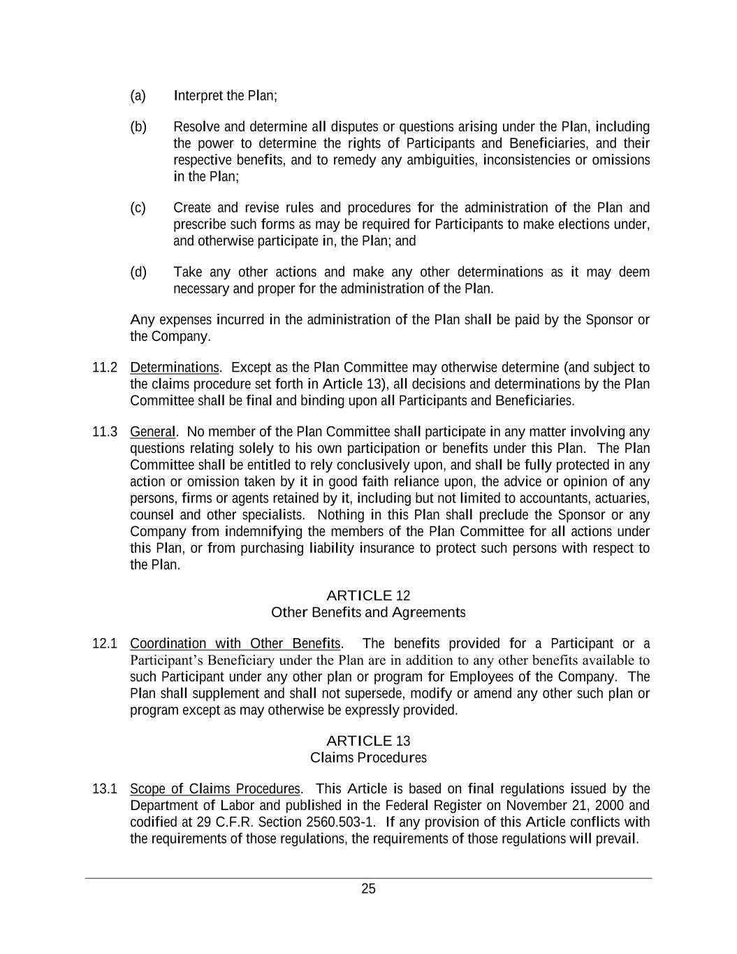 25 (a) Interpret the Plan; (b) Resolve and determine all disputes or questions arising under the Plan, including the power to determine the rights of Participants and Beneficiaries, and their respective benefits, and to remedy any ambiguities, inconsistencies or omissions in the Plan; (c) Create and revise rules and procedures for the administration of the Plan and prescribe such forms as may be required for Participants to make elections under, and otherwise participate in, the Plan; and (d) Take any other actions and make any other determinations as it may deem necessary and proper for the administration of the Plan. Any expenses incurred in the administration of the Plan shall be paid by the Sponsor or the Company. 11.2 Determinations. Except as the Plan Committee may otherwise determine (and subject to the claims procedure set forth in Article 13), all decisions and determinations by the Plan Committee shall be final and binding upon all Participants and Beneficiaries. 11.3 General. No member of the Plan Committee shall participate in any matter involving any questions relating solely to his own participation or benefits under this Plan. The Plan Committee shall be entitled to rely conclusively upon, and shall be fully protected in any action or omission taken by it in good faith reliance upon, the advice or opinion of any persons, firms or agents retained by it, including but not limited to accountants, actuaries, counsel and other specialists. Nothing in this Plan shall preclude the Sponsor or any Company from indemnifying the members of the Plan Committee for all actions under this Plan, or from purchasing liability insurance to protect such persons with respect to the Plan. ARTICLE 12 Other Benefits and Agreements 12.1 Coordination with Other Benefits. The benefits provided for a Participant or a Participant’s Beneficiary under the Plan are in addition to any other benefits available to such Participant under any other plan or program for Employees of the Company. The Plan shall supplement and shall not supersede, modify or amend any other such plan or program except as may otherwise be expressly provided. ARTICLE 13 Claims Procedures 13.1 Scope of Claims Procedures. This Article is based on final regulations issued by the Department of Labor and published in the Federal Register on November 21, 2000 and codified at 29 C.F.R. Section 2560.503-1. If any provision of this Article conflicts with the requirements of those regulations, the requirements of those regulations will prevail.