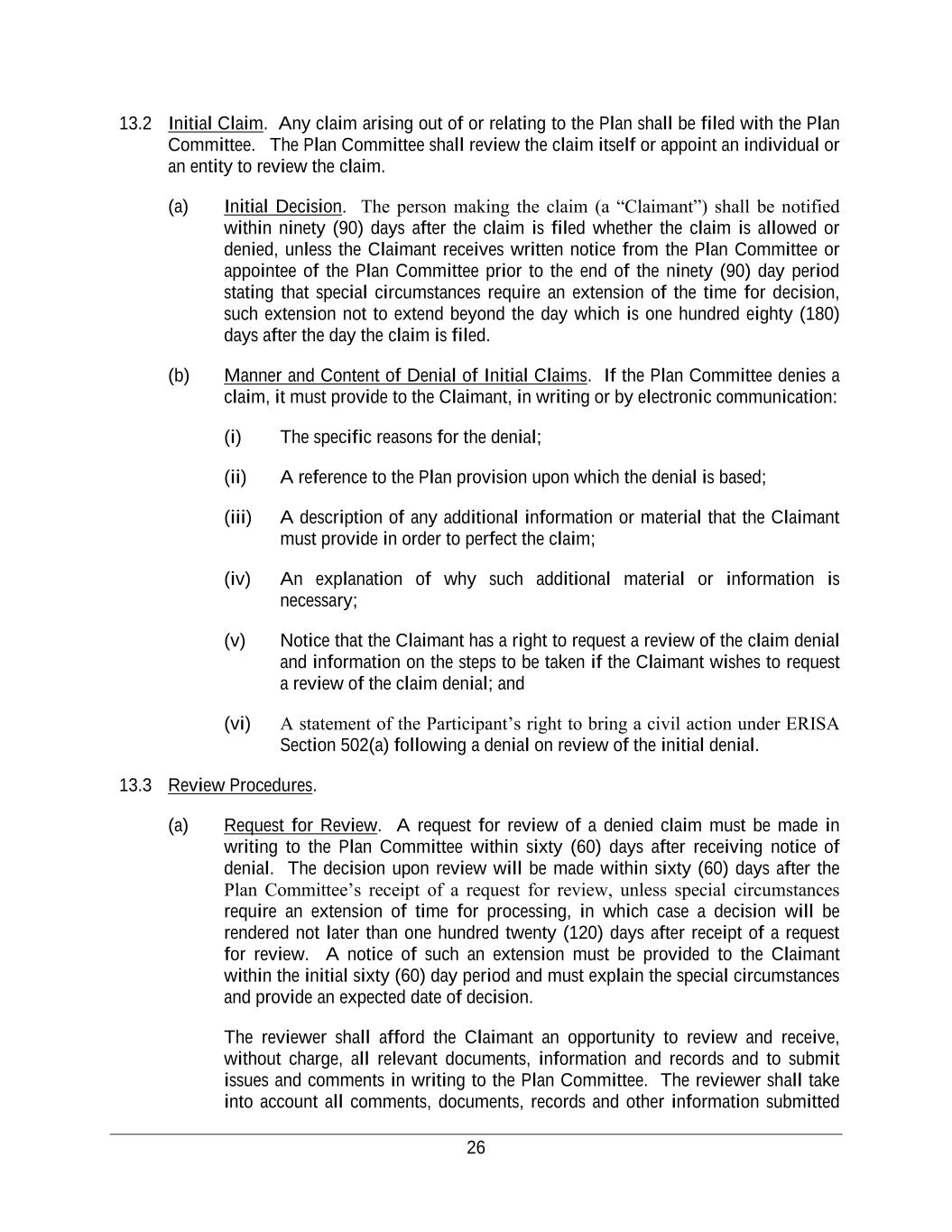 26 13.2 Initial Claim. Any claim arising out of or relating to the Plan shall be filed with the Plan Committee. The Plan Committee shall review the claim itself or appoint an individual or an entity to review the claim. (a) Initial Decision. The person making the claim (a “Claimant”) shall be notified within ninety (90) days after the claim is filed whether the claim is allowed or denied, unless the Claimant receives written notice from the Plan Committee or appointee of the Plan Committee prior to the end of the ninety (90) day period stating that special circumstances require an extension of the time for decision, such extension not to extend beyond the day which is one hundred eighty (180) days after the day the claim is filed. (b) Manner and Content of Denial of Initial Claims. If the Plan Committee denies a claim, it must provide to the Claimant, in writing or by electronic communication: (i) The specific reasons for the denial; (ii) A reference to the Plan provision upon which the denial is based; (iii) A description of any additional information or material that the Claimant must provide in order to perfect the claim; (iv) An explanation of why such additional material or information is necessary; (v) Notice that the Claimant has a right to request a review of the claim denial and information on the steps to be taken if the Claimant wishes to request a review of the claim denial; and (vi) A statement of the Participant’s right to bring a civil action under ERISA Section 502(a) following a denial on review of the initial denial. 13.3 Review Procedures. (a) Request for Review. A request for review of a denied claim must be made in writing to the Plan Committee within sixty (60) days after receiving notice of denial. The decision upon review will be made within sixty (60) days after the Plan Committee’s receipt of a request for review, unless special circumstances require an extension of time for processing, in which case a decision will be rendered not later than one hundred twenty (120) days after receipt of a request for review. A notice of such an extension must be provided to the Claimant within the initial sixty (60) day period and must explain the special circumstances and provide an expected date of decision. The reviewer shall afford the Claimant an opportunity to review and receive, without charge, all relevant documents, information and records and to submit issues and comments in writing to the Plan Committee. The reviewer shall take into account all comments, documents, records and other information submitted