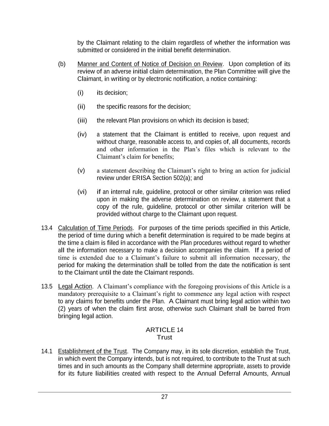 27 by the Claimant relating to the claim regardless of whether the information was submitted or considered in the initial benefit determination. (b) Manner and Content of Notice of Decision on Review. Upon completion of its review of an adverse initial claim determination, the Plan Committee will give the Claimant, in writing or by electronic notification, a notice containing: (i) its decision; (ii) the specific reasons for the decision; (iii) the relevant Plan provisions on which its decision is based; (iv) a statement that the Claimant is entitled to receive, upon request and without charge, reasonable access to, and copies of, all documents, records and other information in the Plan’s files which is relevant to the Claimant’s claim for benefits; (v) a statement describing the Claimant’s right to bring an action for judicial review under ERISA Section 502(a); and (vi) if an internal rule, guideline, protocol or other similar criterion was relied upon in making the adverse determination on review, a statement that a copy of the rule, guideline, protocol or other similar criterion will be provided without charge to the Claimant upon request. 13.4 Calculation of Time Periods. For purposes of the time periods specified in this Article, the period of time during which a benefit determination is required to be made begins at the time a claim is filed in accordance with the Plan procedures without regard to whether all the information necessary to make a decision accompanies the claim. If a period of time is extended due to a Claimant’s failure to submit all information necessary, the period for making the determination shall be tolled from the date the notification is sent to the Claimant until the date the Claimant responds. 13.5 Legal Action. A Claimant’s compliance with the foregoing provisions of this Article is a mandatory prerequisite to a Claimant’s right to commence any legal action with respect to any claims for benefits under the Plan. A Claimant must bring legal action within two (2) years of when the claim first arose, otherwise such Claimant shall be barred from bringing legal action. ARTICLE 14 Trust 14.1 Establishment of the Trust. The Company may, in its sole discretion, establish the Trust, in which event the Company intends, but is not required, to contribute to the Trust at such times and in such amounts as the Company shall determine appropriate, assets to provide for its future liabilities created with respect to the Annual Deferral Amounts, Annual