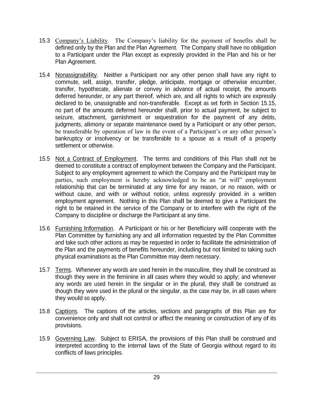 29 15.3 Company’s Liability. The Company’s liability for the payment of benefits shall be defined only by the Plan and the Plan Agreement. The Company shall have no obligation to a Participant under the Plan except as expressly provided in the Plan and his or her Plan Agreement. 15.4 Nonassignability. Neither a Participant nor any other person shall have any right to commute, sell, assign, transfer, pledge, anticipate, mortgage or otherwise encumber, transfer, hypothecate, alienate or convey in advance of actual receipt, the amounts deferred hereunder, or any part thereof, which are, and all rights to which are expressly declared to be, unassignable and non-transferable. Except as set forth in Section 15.15, no part of the amounts deferred hereunder shall, prior to actual payment, be subject to seizure, attachment, garnishment or sequestration for the payment of any debts, judgments, alimony or separate maintenance owed by a Participant or any other person, be transferable by operation of law in the event of a Participant’s or any other person’s bankruptcy or insolvency or be transferable to a spouse as a result of a property settlement or otherwise. 15.5 Not a Contract of Employment. The terms and conditions of this Plan shall not be deemed to constitute a contract of employment between the Company and the Participant. Subject to any employment agreement to which the Company and the Participant may be parties, such employment is hereby acknowledged to be an “at will” employment relationship that can be terminated at any time for any reason, or no reason, with or without cause, and with or without notice, unless expressly provided in a written employment agreement. Nothing in this Plan shall be deemed to give a Participant the right to be retained in the service of the Company or to interfere with the right of the Company to discipline or discharge the Participant at any time. 15.6 Furnishing Information. A Participant or his or her Beneficiary will cooperate with the Plan Committee by furnishing any and all information requested by the Plan Committee and take such other actions as may be requested in order to facilitate the administration of the Plan and the payments of benefits hereunder, including but not limited to taking such physical examinations as the Plan Committee may deem necessary. 15.7 Terms. Whenever any words are used herein in the masculine, they shall be construed as though they were in the feminine in all cases where they would so apply; and whenever any words are used herein in the singular or in the plural, they shall be construed as though they were used in the plural or the singular, as the case may be, in all cases where they would so apply. 15.8 Captions. The captions of the articles, sections and paragraphs of this Plan are for convenience only and shall not control or affect the meaning or construction of any of its provisions. 15.9 Governing Law. Subject to ERISA, the provisions of this Plan shall be construed and interpreted according to the internal laws of the State of Georgia without regard to its conflicts of laws principles.