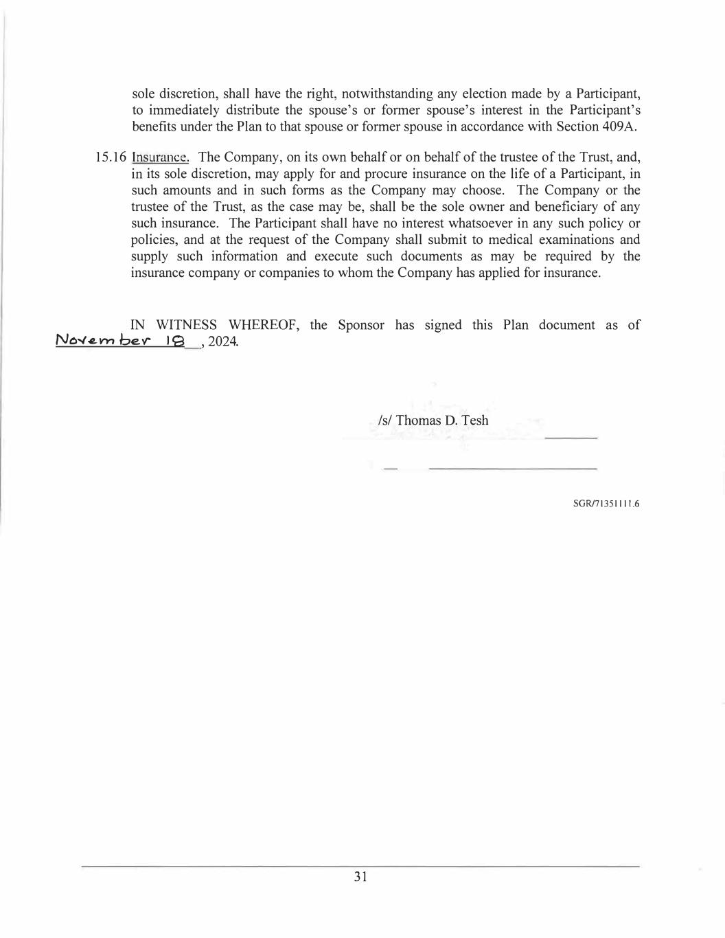 sole discretion, shall have the right, notwithstanding any election made by a Participant, to immediately distribute the spouse's or former spouse's interest in the Participant's benefits under the Plan to that spouse or former spouse in accordance with Section 409A. 15.16 Insurance. The Company, on its own behalf or on behalf of the trustee of the Trust, and, in its sole discretion, may apply for and procure insurance on the life of a Participant, in such amounts and in such forms as the Company may choose. The Company or the trustee of the Trust, as the case may be, shall be the sole owner and beneficiary of any such insurance. The Participant shall have no interest whatsoever in any such policy or policies, and at the request of the Company shall submit to medical examinations and supply such information and execute such documents as may be required by the insurance company or companies to whom the Company has applied for insurance. IN WITNESS WHEREOF, the Sponsor has signed this Plan document as of No-..f.e.n-, be-r I g , 2024. 31 SGR/71351111.6 /s/ Thomas D. Tesh