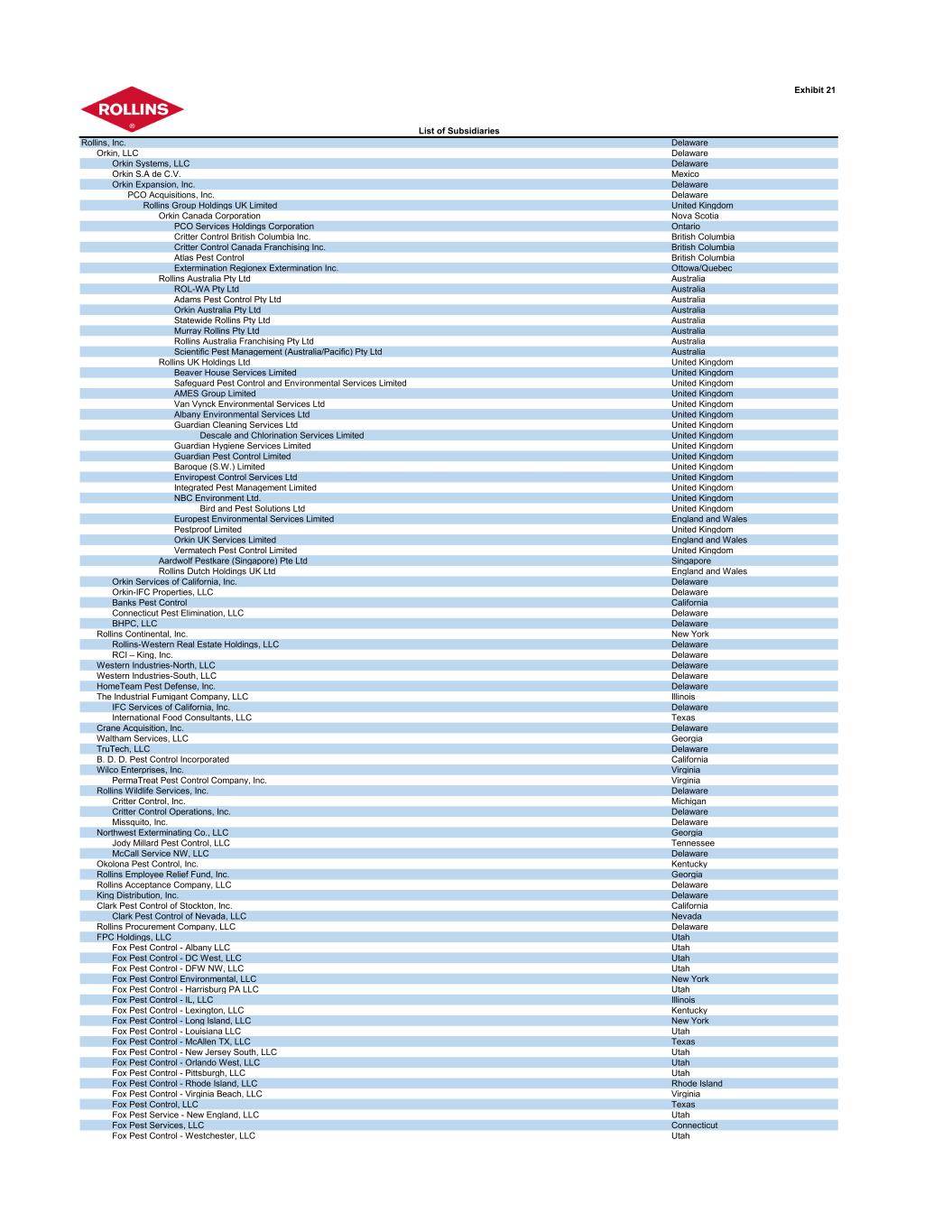 Exhibit 21 Rollins, Inc. Delaware Orkin, LLC Delaware Orkin Systems, LLC Delaware Orkin S.A de C.V. Mexico Orkin Expansion, Inc. Delaware PCO Acquisitions, Inc. Delaware Rollins Group Holdings UK Limited United Kingdom Orkin Canada Corporation Nova Scotia PCO Services Holdings Corporation Ontario Critter Control British Columbia Inc. British Columbia Critter Control Canada Franchising Inc. British Columbia Atlas Pest Control British Columbia Extermination Regionex Extermination Inc. Ottowa/Quebec Rollins Australia Pty Ltd Australia ROL-WA Pty Ltd Australia Adams Pest Control Pty Ltd Australia Orkin Australia Pty Ltd Australia Statewide Rollins Pty Ltd Australia Murray Rollins Pty Ltd Australia Rollins Australia Franchising Pty Ltd Australia Scientific Pest Management (Australia/Pacific) Pty Ltd Australia Rollins UK Holdings Ltd United Kingdom Beaver House Services Limited United Kingdom Safeguard Pest Control and Environmental Services Limited United Kingdom AMES Group Limited United Kingdom Van Vynck Environmental Services Ltd United Kingdom Albany Environmental Services Ltd United Kingdom Guardian Cleaning Services Ltd United Kingdom Descale and Chlorination Services Limited United Kingdom Guardian Hygiene Services Limited United Kingdom Guardian Pest Control Limited United Kingdom Baroque (S.W.) Limited United Kingdom Enviropest Control Services Ltd United Kingdom Integrated Pest Management Limited United Kingdom NBC Environment Ltd. United Kingdom Bird and Pest Solutions Ltd United Kingdom Europest Environmental Services Limited England and Wales Pestproof Limited United Kingdom Orkin UK Services Limited England and Wales Vermatech Pest Control Limited United Kingdom Aardwolf Pestkare (Singapore) Pte Ltd Singapore Rollins Dutch Holdings UK Ltd England and Wales Orkin Services of California, Inc. Delaware Orkin-IFC Properties, LLC Delaware Banks Pest Control California Connecticut Pest Elimination, LLC Delaware BHPC, LLC Delaware Rollins Continental, Inc. New York Rollins-Western Real Estate Holdings, LLC Delaware RCI – King, Inc. Delaware Western Industries-North, LLC Delaware Western Industries-South, LLC Delaware HomeTeam Pest Defense, Inc. Delaware The Industrial Fumigant Company, LLC Illinois IFC Services of California, Inc. Delaware International Food Consultants, LLC Texas Crane Acquisition, Inc. Delaware Waltham Services, LLC Georgia TruTech, LLC Delaware B. D. D. Pest Control Incorporated California Wilco Enterprises, Inc. Virginia PermaTreat Pest Control Company, Inc. Virginia Rollins Wildlife Services, Inc. Delaware Critter Control, Inc. Michigan Critter Control Operations, Inc. Delaware Missquito, Inc. Delaware Northwest Exterminating Co., LLC Georgia Jody Millard Pest Control, LLC Tennessee McCall Service NW, LLC Delaware Okolona Pest Control, Inc. Kentucky Rollins Employee Relief Fund, Inc. Georgia Rollins Acceptance Company, LLC Delaware King Distribution, Inc. Delaware Clark Pest Control of Stockton, Inc. California Clark Pest Control of Nevada, LLC Nevada Rollins Procurement Company, LLC Delaware FPC Holdings, LLC Utah Fox Pest Control - Albany LLC Utah Fox Pest Control - DC West, LLC Utah Fox Pest Control - DFW NW, LLC Utah Fox Pest Control Environmental, LLC New York Fox Pest Control - Harrisburg PA LLC Utah Fox Pest Control - IL, LLC Illinois Fox Pest Control - Lexington, LLC Kentucky Fox Pest Control - Long Island, LLC New York Fox Pest Control - Louisiana LLC Utah Fox Pest Control - McAllen TX, LLC Texas Fox Pest Control - New Jersey South, LLC Utah Fox Pest Control - Orlando West, LLC Utah Fox Pest Control - Pittsburgh, LLC Utah Fox Pest Control - Rhode Island, LLC Rhode Island Fox Pest Control - Virginia Beach, LLC Virginia Fox Pest Control, LLC Texas Fox Pest Service - New England, LLC Utah Fox Pest Services, LLC Connecticut Fox Pest Control - Westchester, LLC Utah List of Subsidiaries