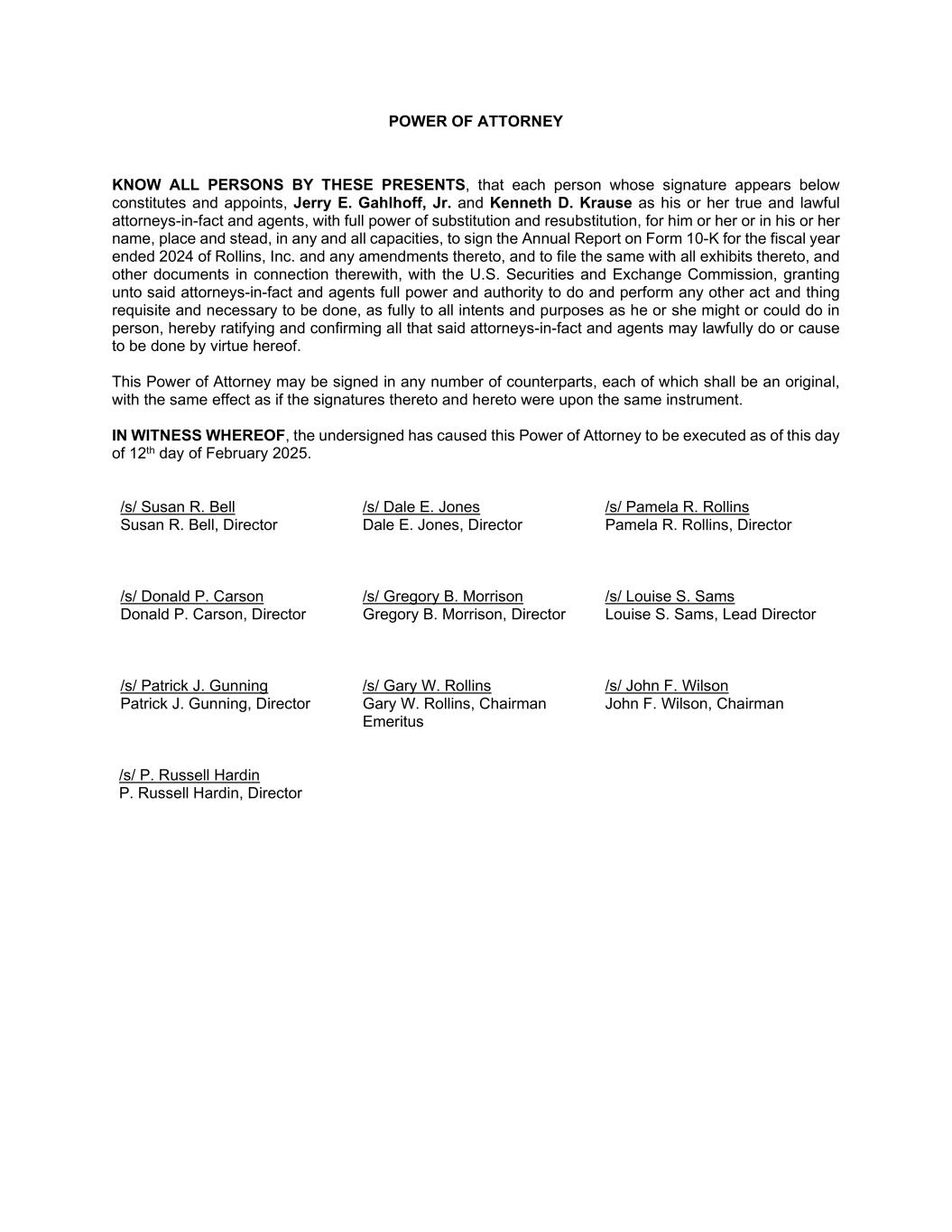 POWER OF ATTORNEY KNOW ALL PERSONS BY THESE PRESENTS, that each person whose signature appears below constitutes and appoints, Jerry E. Gahlhoff, Jr. and Kenneth D. Krause as his or her true and lawful attorneys-in-fact and agents, with full power of substitution and resubstitution, for him or her or in his or her name, place and stead, in any and all capacities, to sign the Annual Report on Form 10-K for the fiscal year ended 2024 of Rollins, Inc. and any amendments thereto, and to file the same with all exhibits thereto, and other documents in connection therewith, with the U.S. Securities and Exchange Commission, granting unto said attorneys-in-fact and agents full power and authority to do and perform any other act and thing requisite and necessary to be done, as fully to all intents and purposes as he or she might or could do in person, hereby ratifying and confirming all that said attorneys-in-fact and agents may lawfully do or cause to be done by virtue hereof. This Power of Attorney may be signed in any number of counterparts, each of which shall be an original, with the same effect as if the signatures thereto and hereto were upon the same instrument. IN WITNESS WHEREOF, the undersigned has caused this Power of Attorney to be executed as of this day of 12th day of February 2025. /s/ Susan R. Bell Susan R. Bell, Director /s/ Dale E. Jones Dale E. Jones, Director /s/ Pamela R. Rollins Pamela R. Rollins, Director /s/ Donald P. Carson Donald P. Carson, Director /s/ Gregory B. Morrison Gregory B. Morrison, Director /s/ Louise S. Sams Louise S. Sams, Lead Director /s/ Patrick J. Gunning Patrick J. Gunning, Director /s/ Gary W. Rollins Gary W. Rollins, Chairman Emeritus /s/ John F. Wilson John F. Wilson, Chairman /s/ P. Russell Hardin P. Russell Hardin, Director