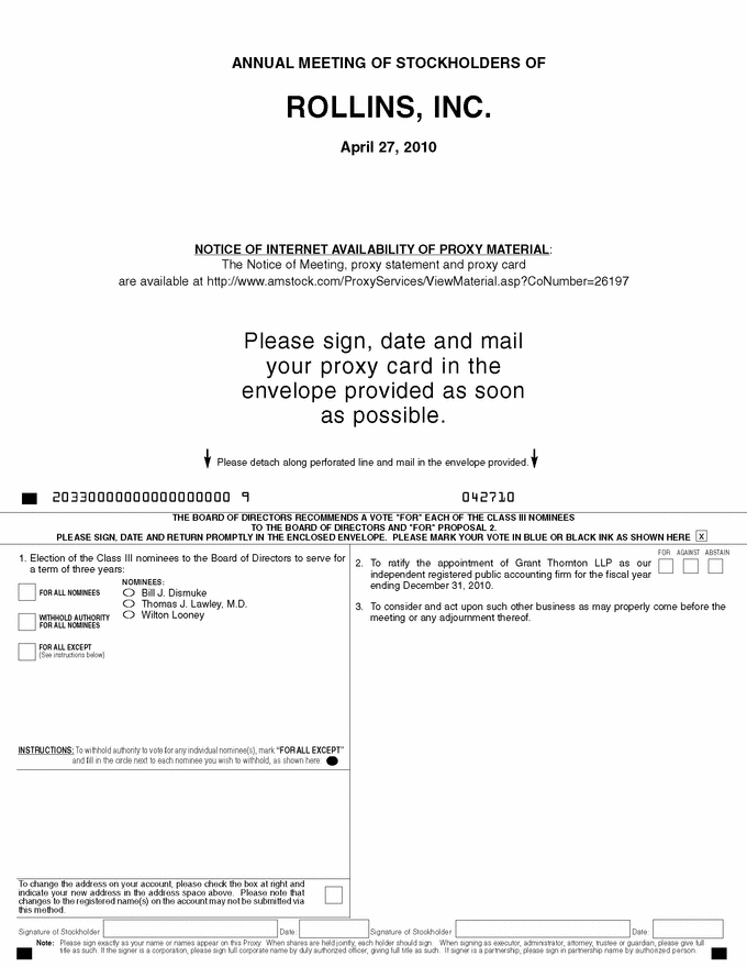 ANNUAL MEETING OF STOCKHOLDERS OF ROLLINS, INC. April 27, 2010 NOTICE OF INTERNET AVAILABILITY OF PROXY MATERIAL: The Notice of Meeting, proxy statement and proxy card are available at http://www.amstock.com/ProxyServices/ViewMaterial.asp?CoNumber=26197 Please sign, date and mail your proxy card in the envelope provided as soon as possible. Signature of Stockholder Date: Signature of Stockholder Date: Note: Please sign exactly as your name or names appear on this Proxy. When shares are held jointly, each holder should sign. When signing as executor, administrator, attorney, trustee or guardian, please give full title as such. If the signer is a corporation, please sign full corporate name by duly authorized officer, giving full title as such. If signer is a partnership, please sign in partnership name by authorized person. To change the address on your account, please check the box at right and indicate your new address in the address space above. Please note that changes to the registered name(s) on the account may not be submitted via this method. 1. Election of the Class III nominees to the Board of Directors to serve for a term of three years: O Bill J. Dismuke O Thomas J. Lawley, M.D. O Wilton Looney 2. To ratify the appointment of Grant Thornton LLP as our independent registered public accounting firm for the fiscal year ending December 31, 2010. 3. To consider and act upon such other business as may properly come before the meeting or any adjournment thereof. FOR AGAINST ABSTAIN FOR ALL NOMINEES WITHHOLD AUTHORITY FOR ALL NOMINEES FOR ALL EXCEPT (See instructions below) INSTRUCTIONS: To withhold authority to vote for any individual nominee(s), mark FOR ALL EXCEPT and fill in the circle next to each nominee you wish to withhold, as shown here: NOMINEES: THE BOARD OF DIRECTORS RECOMMENDS A VOTE "FOR" EACH OF THE CLASS III NOMINEES TO THE BOARD OF DIRECTORS AND "FOR" PROPOSAL 2. PLEASE SIGN, DATE AND RETURN PROMPTLY IN THE ENCLOSED ENVELOPE. PLEASE MARK YOUR VOTE IN BLUE OR BLACK INK AS SHOWN HERE x Please detach along perforated line and mail in the envelope provided. 20330000000000000000 9 042710 |