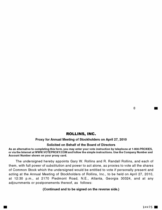 0 14475 ROLLINS, INC. Proxy for Annual Meeting of Stockholders on April 27, 2010 Solicited on Behalf of the Board of Directors As an alternative to completing this form, you may enter your vote instruction by telephone at 1-800-PROXIES, or via the Internet at WWW.VOTEPROXY.COM and follow the simple instructions. Use the Company Number and Account Number shown on your proxy card. The undersigned hereby appoints Gary W. Rollins and R. Randall Rollins, and each of them, with full power of substitution and power to act alone, as proxies to vote all the shares of Common Stock which the undersigned would be entitled to vote if personally present and acting at the Annual Meeting of Stockholders of Rollins, Inc., to be held on April 27, 2010, at 12:30 p.m., at 2170 Piedmont Road, N.E., Atlanta, Georgia 30324, and at any adjournments or postponements thereof, as follows: (Continued and to be signed on the reverse side.) |