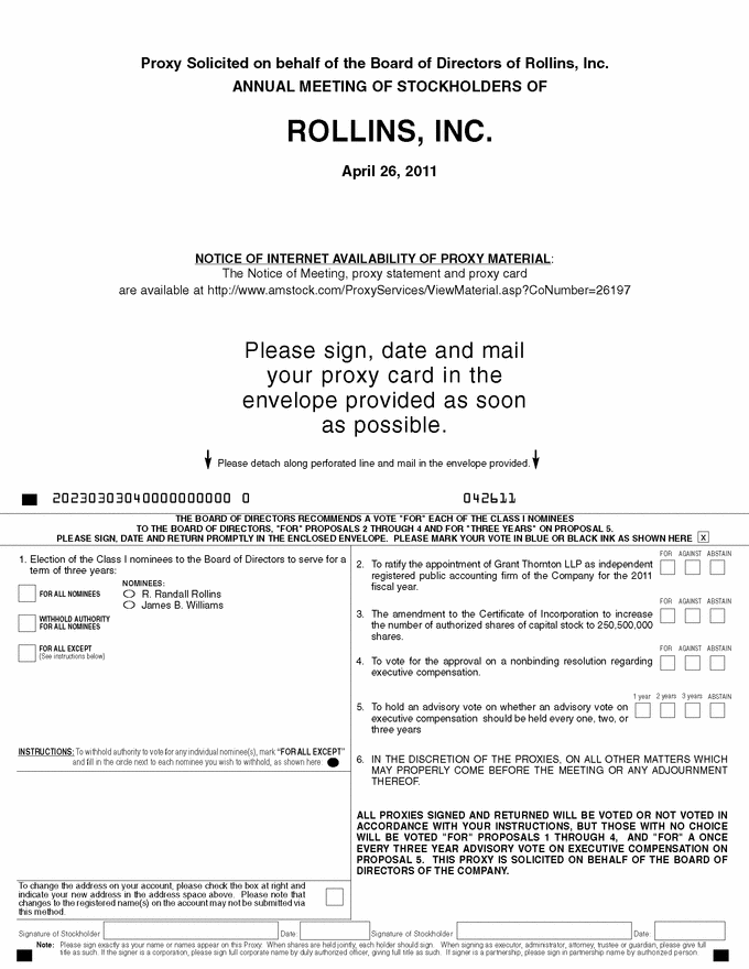 Signature of Stockholder Date: Signature of Stockholder Date: Note: Please sign exactly as your name or names appear on this Proxy. When shares are held jointly, each holder should sign. When signing as executor, administrator, attorney, trustee or guardian, please give full title as such. If the signer is a corporation, please sign full corporate name by duly authorized officer, giving full title as such. If signer is a partnership, please sign in partnership name by authorized person. To change the address on your account, please check the box at right and indicate your new address in the address space above. Please note that changes to the registered name(s) on the account may not be submitted via this method. 1. Election of the Class I nominees to the Board of Directors to serve for a term of three years: O R. Randall Rollins O James B. Williams 2. To ratify the appointment of Grant Thornton LLP as independent registered public accounting firm of the Company for the 2011 fiscal year. 3. The amendment to the Certificate of Incorporation to increase the number of authorized shares of capital stock to 250,500,000 shares. 4. To vote for the approval on a nonbinding resolution regarding executive compensation. 5. To hold an advisory vote on whether an advisory vote on executive compensation should be held every one, two, or three years 6. IN THE DISCRETION OF THE PROXIES, ON ALL OTHER MATTERS WHICH MAY PROPERLY COME BEFORE THE MEETING OR ANY ADJOURNMENT THEREOF. ALL PROXIES SIGNED AND RETURNED WILL BE VOTED OR NOT VOTED IN ACCORDANCE WITH YOUR INSTRUCTIONS, BUT THOSE WITH NO CHOICE WILL BE VOTED "FOR" PROPOSALS 1 THROUGH 4, AND "FOR" A ONCE EVERY THREE YEAR ADVISORY VOTE ON EXECUTIVE COMPENSATION ON PROPOSAL 5. THIS PROXY IS SOLICITED ON BEHALF OF THE BOARD OF DIRECTORS OF THE COMPANY. FOR AGAINST ABSTAIN FOR ALL NOMINEES WITHHOLD AUTHORITY FOR ALL NOMINEES FOR ALL EXCEPT (See instructions below) INSTRUCTIONS: To withhold authority to vote for any individual nominee(s), mark FOR ALL EXCEPT and fill in the circle next to each nominee you wish to withhold, as shown here: JOHN SMITH 1234 MAIN STREET APT. 203 NEW YORK, NY 10038 NOMINEES: ANNUAL MEETING OF STOCKHOLDERS OF ROLLINS, INC. April 26, 2011 INTERNET - Access www.voteproxy.com and follow the on-screen instructions. Have your proxy card available when you access the web page, and use the Company Number and Account Number shown on your proxy card. TELEPHONE - Call toll-free 1-800-PROXIES (1-800-776-9437) in the United States or 1-718-921-8500 from foreign countries from any touch-tone telephone and follow the instructions. Have your proxy card available when you call and use the Company Number and Account Number shown on your proxy card. Vote online/phone until 11:59 PM EST the day before the meeting. MAIL - Sign, date and mail your proxy card in the envelope provided as soon as possible. IN PERSON - You may vote your shares in person by attending the Annual Meeting. PROXY VOTING INSTRUCTIONS Please detach along perforated line and mail in the envelope provided IF you are not voting via telephone or the Internet. THE BOARD OF DIRECTORS RECOMMENDS A VOTE "FOR" EACH OF THE CLASS I NOMINEES TO THE BOARD OF DIRECTORS, "FOR" PROPOSALS 2 THROUGH 4 AND FOR "THREE YEARS" ON PROPOSAL 5. PLEASE SIGN, DATE AND RETURN PROMPTLY IN THE ENCLOSED ENVELOPE. PLEASE MARK YOUR VOTE IN BLUE OR BLACK INK AS SHOWN HERE x --------------- ---------------- 20230303040000000000 0 042611 COMPANY NUMBER ACCOUNT NUMBER NOTICE OF INTERNET AVAILABILITY OF PROXY MATERIAL: The Notice of Meeting, proxy statement and proxy card are available at http://www.amstock.com/ProxyServices/ViewMaterial.asp?CoNumber=26197 FOR AGAINST ABSTAIN FOR AGAINST ABSTAIN 2 years 3 years ABSTAIN 1 year |