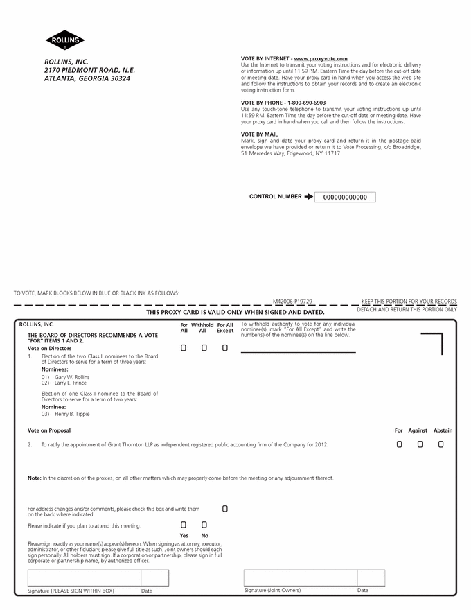 CONTROL NUMBER 000000000000 TO VOTE, MARK BLOCKS BELOW IN BLUE OR BLACK INK AS FOLLOWS: KEEP THIS PORTION FOR YOUR RECORDS DETACH AND RETURN THIS PORTION ONLY THIS PROXY CARD IS VALID ONLY WHEN SIGNED AND DATED. Signature (Joint Owners) Date Date Signature [PLEASE SIGN WITHIN BOX] VOTE BY INTERNET - www.proxyvote.com Use the Internet to transmit your voting instructions and for electronic delivery of information up until 11:59 P.M. Eastern Time the day before the cut-off date or meeting date. Have your proxy card in hand when you access the web site and follow the instructions to obtain your records and to create an electronic voting instruction form. VOTE BY PHONE - 1-800-690-6903 Use any touch-tone telephone to transmit your voting instructions up until 11:59 P.M. Eastern Time the day before the cut-off date or meeting date. Have your proxy card in hand when you call and then follow the instructions. VOTE BY MAIL Mark, sign and date your proxy card and return it in the postage-paid envelope we have provided or return it to Vote Processing, c/o Broadridge, 51 Mercedes Way, Edgewood, NY 11717. ROLLINS, INC. 2170 PIEDMONT ROAD, N.E. ATLANTA, GEORGIA 30324 M42006-P19729 To withhold authority to vote for any individual nominee(s), mark For All Except and write the number(s) of the nominee(s) on the line below. ROLLINS, INC. For All Except Withhold All For All THE BOARD OF DIRECTORS RECOMMENDS A VOTE "FOR" ITEMS 1 AND 2. Vote on Directors 1. Election of the two Class II nominees to the Board of Directors to serve for a term of three years: Nominees: 01) Gary W. Rollins 02) Larry L. Prince Election of one Class I nominee to the Board of Directors to serve for a term of two years: Nominee: 03) Henry B. Tippie For Against Abstain Vote on Proposal 2. To ratify the appointment of Grant Thornton LLP as independent registered public accounting firm of the Company for 2012. Note: In the discretion of the proxies, on all other matters which may properly come before the meeting or any adjournment thereof. For address changes and/or comments, please check this box and write them on the back where indicated. Please indicate if you plan to attend this meeting. Yes No Please sign exactly as your name(s) appear(s) hereon. When signing as attorney, executor, administrator, or other fiduciary, please give full title as such. Joint owners should each sign personally. All holders must sign. If a corporation or partnership, please sign in full corporate or partnership name, by authorized officer. |