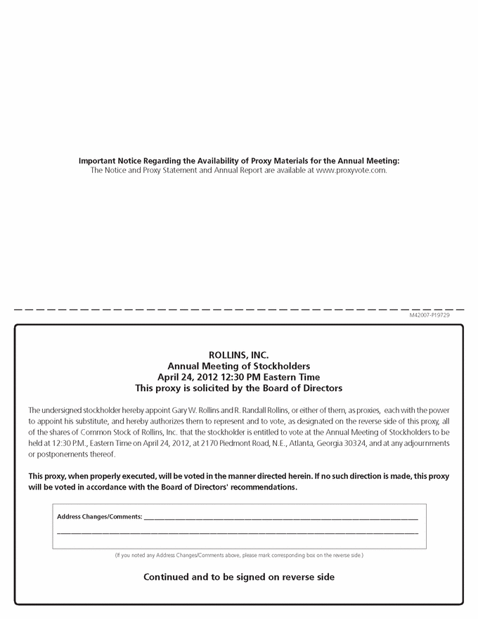 Important Notice Regarding the Availability of Proxy Materials for the Annual Meeting: The Notice and Proxy Statement and Annual Report are available at www.proxyvote.com. M42007-P19729 ROLLINS, INC. Annual Meeting of Stockholders April 24, 2012 12:30 PM Eastern Time This proxy is solicited by the Board of Directors The undersigned stockholder hereby appoint Gary W. Rollins and R. Randall Rollins, or either of them, as proxies, each with the power to appoint his substitute, and hereby authorizes them to represent and to vote, as designated on the reverse side of this proxy, all of the shares of Common Stock of Rollins, Inc. that the stockholder is entitled to vote at the Annual Meeting of Stockholders to be held at 12:30 P.M., Eastern Time on April 24, 2012, at 2170 Piedmont Road, N.E., Atlanta, Georgia 30324, and at any adjournments or postponements thereof. This proxy, when properly executed, will be voted in the manner directed herein. If no such direction is made, this proxy will be voted in accordance with the Board of Directors' recommendations. Address Changes/Comments: (If you noted any Address Changes/Comments above, please mark corresponding box on the reverse side.) Continued and to be signed on reverse side |