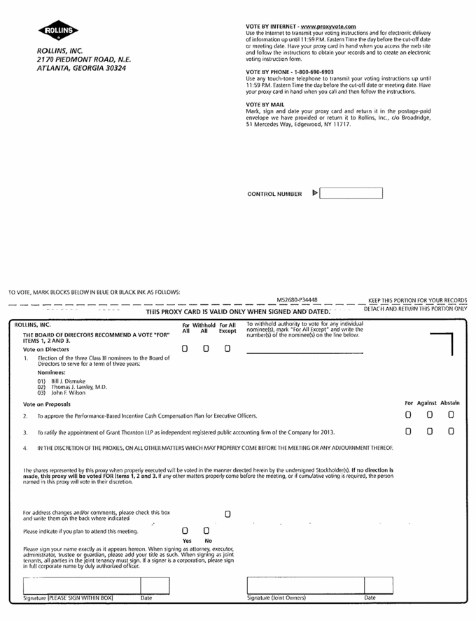 TO VOTE, MARK BLOCKS BELOW IN BLUE OR BLACK INK AS FOLLOWS: KEEP THIS PORTION FOR YOUR RECORDS DETACH AND RETURN THIS PORTION ONLY THIS PROXY CARD IS VALID ONLY WHEN SIGNED AND DATED. Date Signature (Joint Owners) Date Signature [PLEASE SIGN WITHIN BOX] VOTE BY INTERNET - www.proxyvote.com Use the Internet to transmit your voting instructions and for electronic delivery of information up until 11:59 P.M. Eastern Time the day before the cut-off date or meeting date. Have your proxy card in hand when you access the web site and follow the instructions to obtain your records and to create an electronic voting instruction form. VOTE BY PHONE - 1-800-690-6903 Use any touch-tone telephone to transmit your voting instructions up until 11:59 P.M. Eastern Time the day before the cut-off date or meeting date. Have your proxy card in hand when you call and then follow the instructions. VOTE BY MAIL Mark, sign and date your proxy card and return it in the postage-paid envelope we have provided or return it to Rollins, Inc., c/o Broadridge, 51 Mercedes Way, Edgewood, NY 11717. ROLLINS, INC. 2170 PIEDMONT ROAD, N.E. ATLANTA, GEORGIA 30324 M52680-P34448 To withhold authority to vote for any individual nominee(s), mark For All Except and write the number(s) of the nominee(s) on the line below. ROLLINS, INC. Withhold All For All For All Except THE BOARD OF DIRECTORS RECOMMEND A VOTE "FOR" ITEMS 1, 2 AND 3. Vote on Directors 1. Election of the three Class III nominees to the Board of Directors to serve for a term of three years: Nominees: 01) Bill J. Dismuke 02) Thomas J. Lawley, M.D. 03) John F. Wilson For Against Abstain Vote on Proposals 2. To approve the Performance-Based Incentive Cash Compensation Plan for Executive Officers. 3. To ratify the appointment of Grant Thornton LLP as independent registered public accounting firm of the Company for 2013. 4. IN THE DISCRETION OF THE PROXIES, ON ALL OTHER MATTERS WHICH MAY PROPERLY COME BEFORE THE MEETING OR ANY ADJOURNMENT THEREOF. The shares represented by this proxy when properly executed will be voted in the manner directed herein by the undersigned Stockholder(s). If no direction is made, this proxy will be voted FOR items 1, 2 and 3. If any other matters properly come before the meeting, or if cumulative voting is required, the person named in this proxy will vote in their discretion. For address changes and/or comments, please check this box and write them on the back where indicated Please indicate if you plan to attend this meeting. Yes No Please sign your name exactly as it appears hereon. When signing as attorney, executor, administrator, trustee or guardian, please add your title as such. When signing as joint tenants, all parties in the joint tenancy must sign. If a signer is a corporation, please sign in full corporate name by duly authorized officer. Control Number |