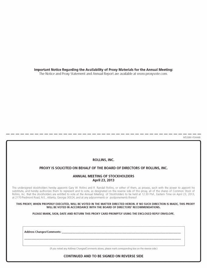 Important Notice Regarding the Availability of Proxy Materials for the Annual Meeting: The Notice and Proxy Statement and Annual Report are available at www.proxyvote.com. M52681-P34448 ROLLINS, INC. PROXY IS SOLICITED ON BEHALF OF THE BOARD OF DIRECTORS OF ROLLINS, INC. ANNUAL MEETING OF STOCKHOLDERS April 23, 2013 The undersigned stockholders hereby appoints Gary W. Rollins and R. Randall Rollins, or either of them, as proxies, each with the power to appoint his substitute, and hereby authorizes them to represent and to vote, as designated on the reverse side of this proxy, all of the shares of Common Stock of Rollins, Inc. that the stockholders are entitled to vote at the Annual Meeting of Stockholders to be held at 12:30 P.M., Eastern Time on April 23, 2013, at 2170 Piedmont Road, N.E., Atlanta, Georgia 30324, and at any adjournments or postponements thereof. THIS PROXY, WHEN PROPERLY EXECUTED, WILL BE VOTED IN THE MATTER DIRECTED HEREIN. IF NO SUCH DIRECTION IS MADE, THIS PROXY WILL BE VOTED IN ACCORDANCE WITH THE BOARD OF DIRECTORS' RECOMMENDATIONS. PLEASE MARK, SIGN, DATE AND RETURN THIS PROXY CARD PROMPTLY USING THE ENCLOSED REPLY ENVELOPE. Address Changes/Comments: (If you noted any Address Changes/Comments above, please mark corresponding box on the reverse side.) CONTINUED AND TO BE SIGNED ON REVERSE SIDE |