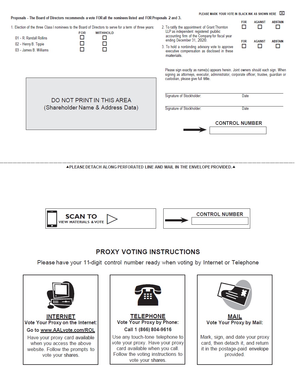 PLEASE MARK YOUR VOTE IN BLACK INK AS SHOWN HERE Proposals - The Board of Directors recommends a vote FOR all the nominees listed and FOR Proposals 2 and 3. 1. Election of the three Class I nominees to the Board of Directors to serve for a term of three years: 01 - R. Randall Rollins 02 - Henry B. Tippie 03 - James B. Williams FOR WITHHOLD 2. To ratify the appointment of Grant Thornton LLP as independent registered public accounting firm of the Company for fiscal year ending December 31, 2020. 3. To hold a nonbinding advisory vote to approve executive compensation as disclosed in these materials. FOR AGAINST ABSTAIN Please sign exactly as name(s) appears herein. Joint owners should each sign. When signing as attorneys, executor, administrator, corporate officer, trustee, guardian or custodian, please give full title. Signature of Stockholder: Date CONTROL NUMBER PLEASE DETACH ALONG PERFORATED LINE AND MAIL IN THE ENVELOPE PROVIDED. SCAN TO VIEW MATERIALS & VOTE CONTROL NUMBER PROXY VOTING INSTRUCTIONS Please have your 11-digit control number ready when voting by Internet or Telephone INTERNET Vote Your Proxy on the Internet: Go to www.AALvote.com/ROL Have your proxy card available when you access the above website. Follow the prompts to vote your shares. TELEPHONE Vote Your Proxy by Phone: Call 1 (866) 804-9616 Use any touch-tone telephone to vote your proxy. Have your proxy card available when you call. Follow the voting instructions to vote your shares. MAIL Vote Your Proxy by Mail:Mark, sign, and date your proxy card, then detach it, and return it in the postage-paid envelope provided.