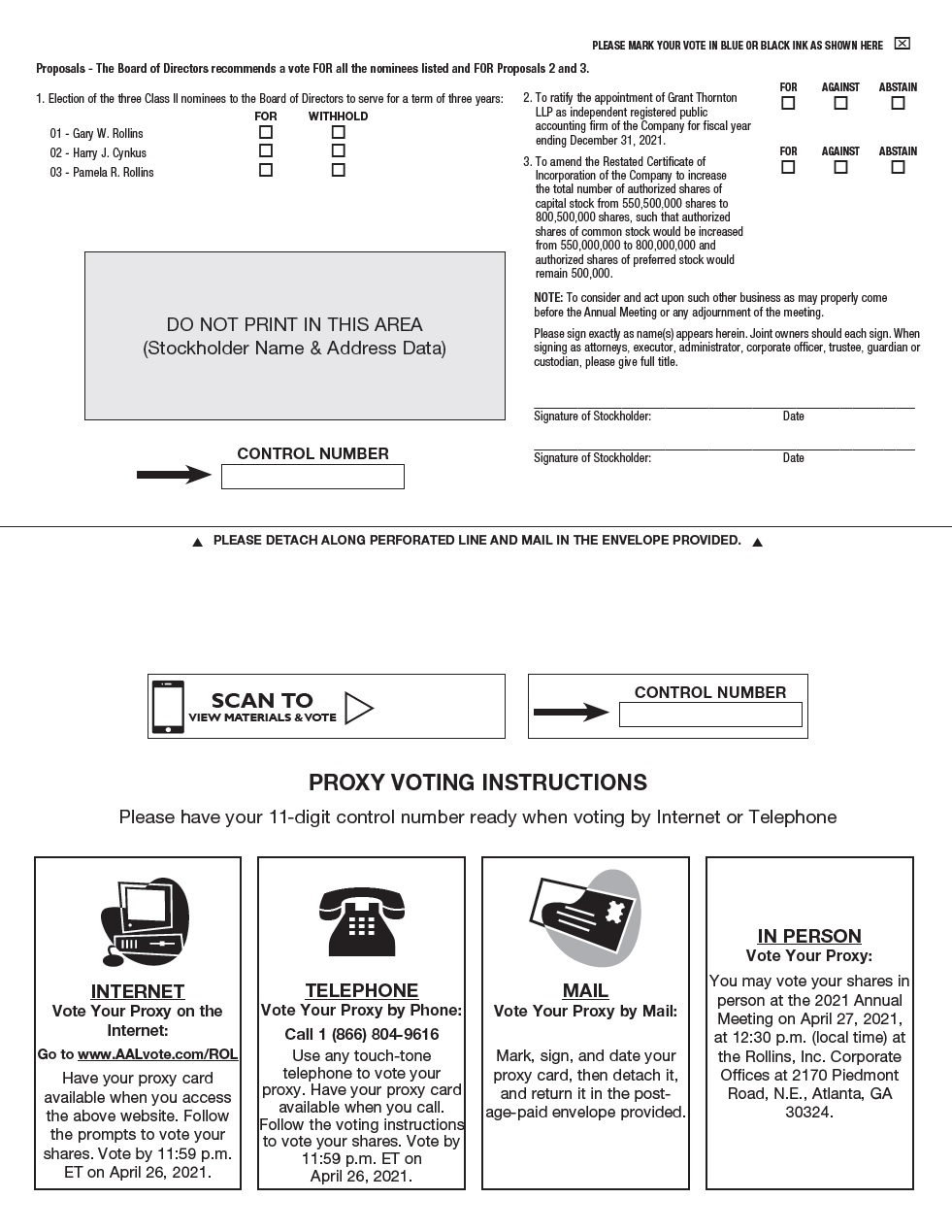 Rollins, Inc. Notice of 2021 Annual Meeting of Shareholders 2170 Piedmont Road, N.E., Atlanta, Georgia 30324 Proxy Solicited by Board of Directors for Annual Meeting – April 27, 2021 The undersigned stockholder(s) hereby appoints Gary W. Rollins and John F. Wilson, and either of them, as proxies to appoint their substitute, and hereby authorize(s) them to represent and to vote, as undersigned on the reversed side of this proxy, all of the shares of the common stock of Rollins, Inc. that the stockholder(s) are entitled to vote at the Annual Meeting of Stockholders to be held at 12:30 P.M., Eastern Time on April 27, 2021, at 2170 Piedmont Road, N.E., Atlanta, Georgia 30324, and at any adjournments or postponements thereof. THIS PROXY WILL BE VOTED AS DIRECTED OR, IF NO DIRECTION IS GIVEN, WILL BE VOTED “FOR” EACH OF THE NOMINEES NAMED IN PROPOSAL 1, AND “FOR” PROPOSALS 2 AND 3. THE PROXIES ARE AUTHORIZED TO VOTE IN THEIR JUDGMENT UPON SUCH OTHER BUSINESS NOT KNOWN AS MAY PROPERLY COME BEFORE THE ANNUAL MEETING OR ANY ADJOURNMENTS THEREOF. (PLEASE VOTE, DATE AND SIGN THIS PROXY ON THE OTHER SIDE AND RETURN PROMPTLY IN THE ENCLOSED ENVELOPE.) Important Notice Regarding the Availability of Proxy Materials for the Annual Meeting of Stockholders to be held April 27, 2021. The Proxy Statement is available at: http://www.viewproxy.com/ROL/2021. PLEASE DETACH ALONG PERFORATED LINE AND MAIL IN THE ENVELOPE PROVIDED.